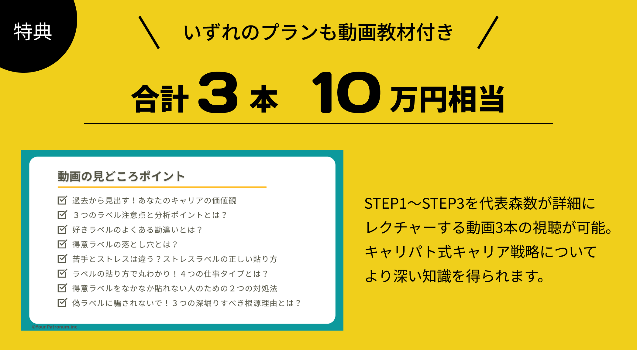 動画教材では、キャリパト式キャリア戦略(STEP1〜3)を体系的に学びます。